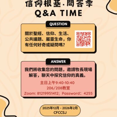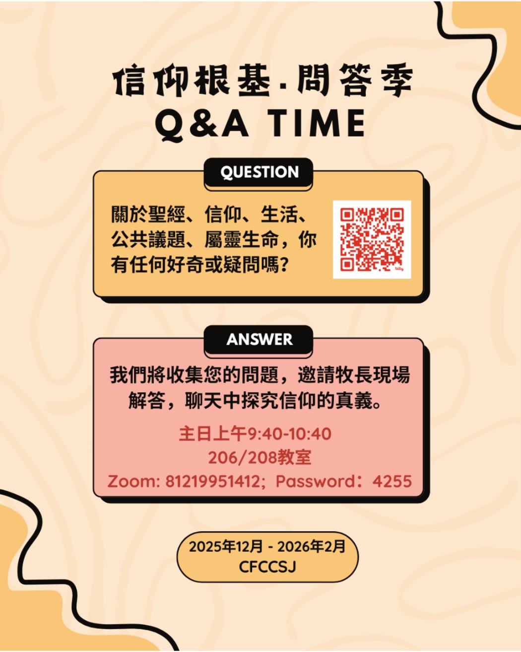 信仰根基班:《信仰根基問答季》 December 7, 2025 – February 28, 2026 9:40 am – 10:40 am CFCCSJ 聖荷西中華歸主教會 4255 Williams Road, San Jose, CA 95129 Get Directions 將主要採取問答的形式,討論弟兄姊妹感興趣的信仰話題。請掃描右側二維碼,提交您想問的問題。福音部同工將收集整理,並邀請牧長團隊討論解答。信仰問答由符辰希傳道主持,在 206/208 教室進行,歡迎現場參與。網絡上課仍然使用原來的 ZOOM。