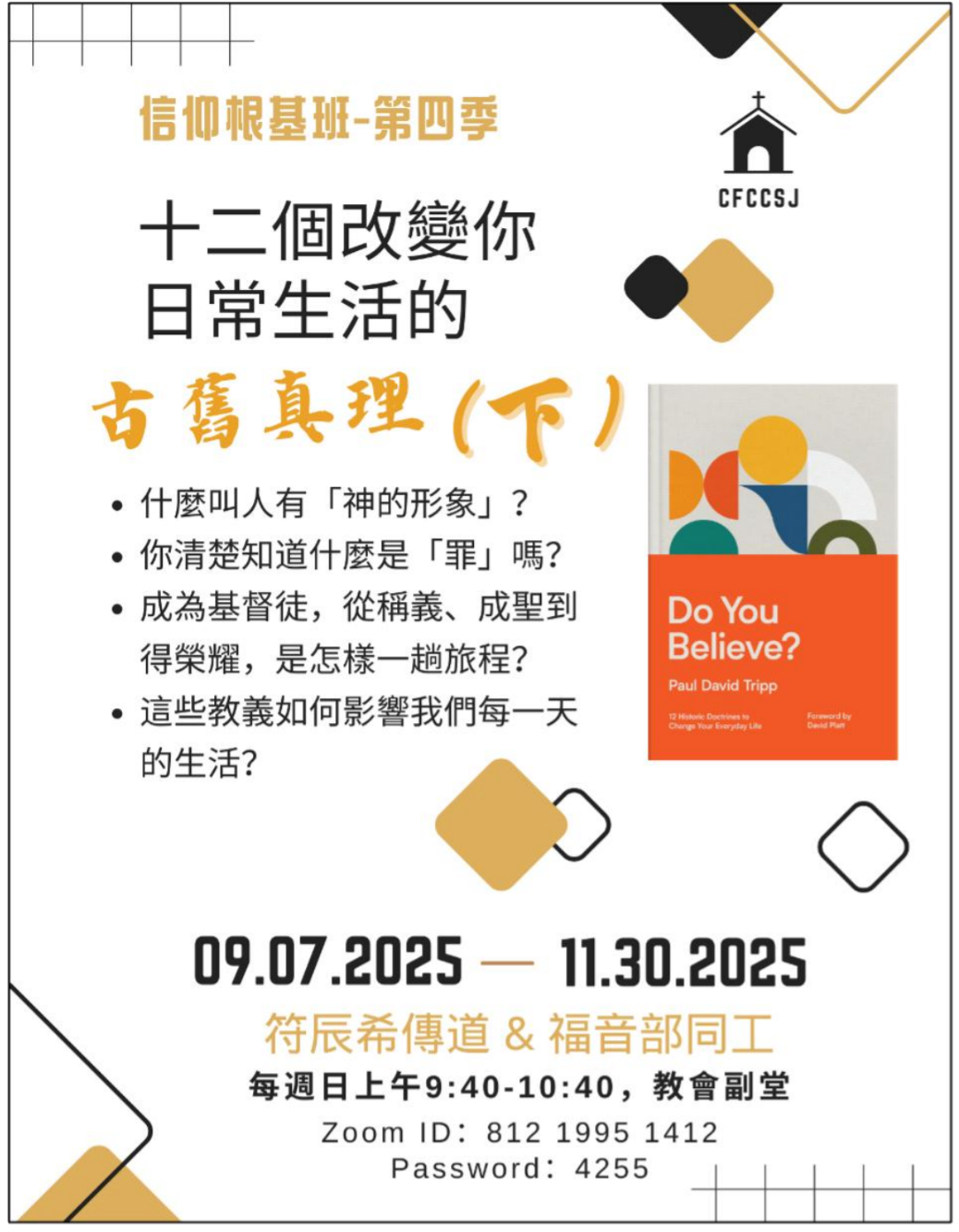 信仰根基班(第四季) September 7 – November 30, 2025 9:40 am – 10:40 am CFCCSJ 聖荷西中華歸主教會 4255 Williams Road, San Jose, CA 95129 Get Directions 本季課程將繼續使用 Paul Tripp 的著作,學習與救恩緊密相關的六條真理與應用,包括神的形象、罪、稱義、成聖等等。有意 11月受洗的慕道朋友,請務必出席;也鼓勵已經受洗的弟兄姊妹踴躍參加,夯實信仰基礎。課程由符辰希傳道和同工們帶領,在 1 樓副堂授課。