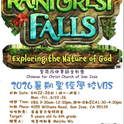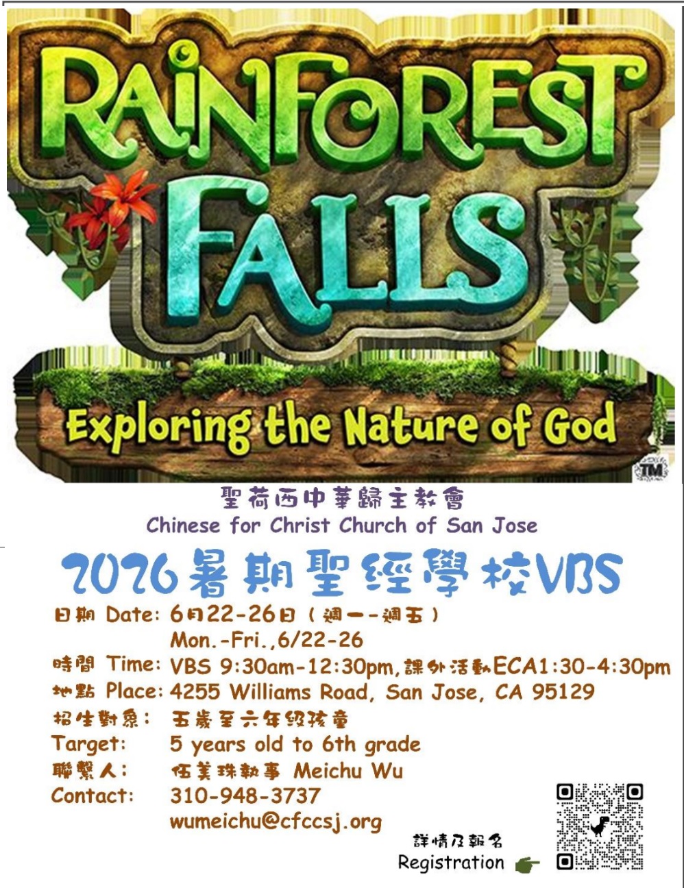 兒童暑期聖經學校 (VBS) June 22 – 26, 2026 9:30 am – 4:30 pm CFCCSJ 聖荷西中華歸主教會 4255 Williams Road, San Jose, CA 92129 Get Directions 參加對象是今年暑假滿五歲至六年級的孩子們,歡迎邀請您的鄰居或是朋友的孩子們一起來參加。我們也需要幫忙的青少年和成人,如果您願意參與 VBS 的服事,請與伍美珠執事聯繫 wumeichu@cfccsj.org。