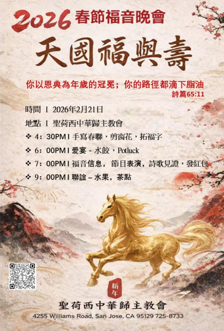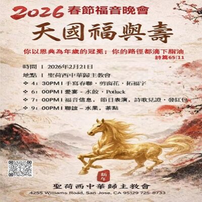 春節福音晚會 February 21, 2026 4:30 pm – 9:00 pm CFCCSJ 聖荷西中華歸主教會 4255 Williams Road, San Jose, CA 95129 Get Directions 春節福音晚會:福音部、迎新部、小組與團契部和節慶部將於 2/21(週六)4:30-9:30pm 在教堂聯合舉辦春節福音晚會。詳情請參閱單張。敬請弟兄姊妹鼓勵並邀請小組和身邊的慕道朋友,親友,鄰居和同事參加!如有問題,請聯繫福音部陳咏梅執事yongmeichen1108@gmail.com。