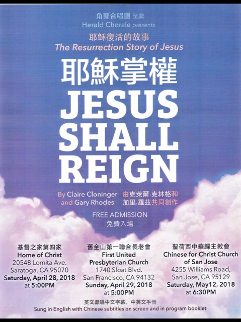 角聲佈道音樂會 May 12, 2018 6:30 pm – 9:30 pm CFCCSJ 聖荷西中華歸主教會 4255 Williams Road, San Jose, CA 95129 5/12(週六)晚上 6:30 在本教會舉行,歡迎弟兄姊妹邀請未信主親友前來聆聽耶穌復活的故事「耶穌掌權」。