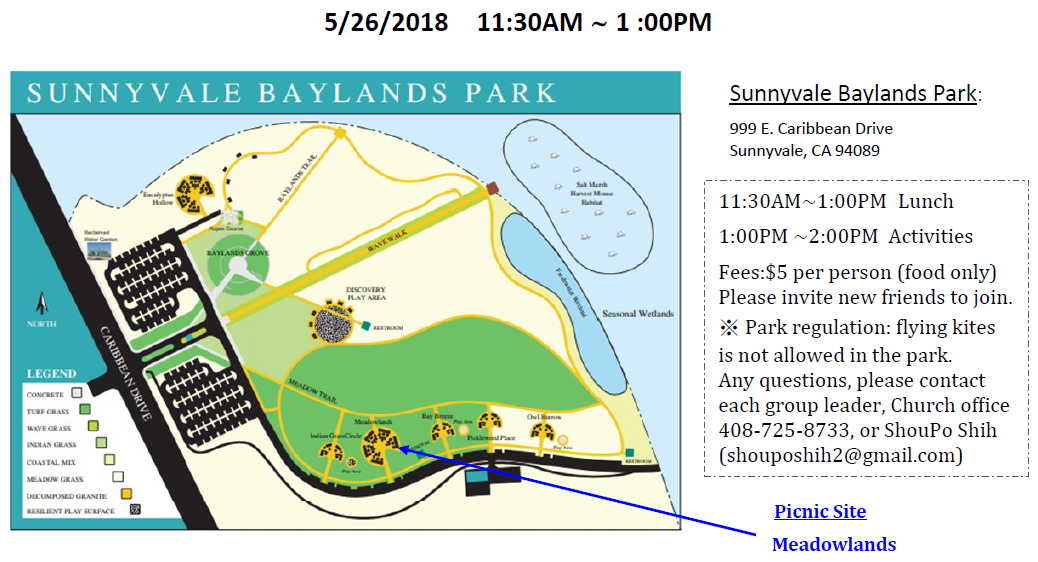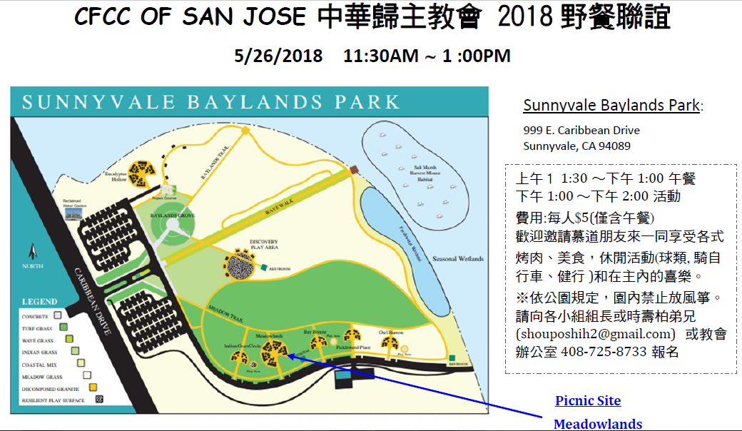 野餐聯誼 May 26, 2018 11:30 am – 1:00 pm Baylands Park 999 E Carib bean Drive, Sunnyvale 5/26(週六)上午 11:30 至下午 1:00 於 Baylands Park,999 E Carib-bean Drive, Sunnyvale 舉行野餐,每人$5,歡迎弟兄姊妹邀請朋友預留時間參加,請向各小組團契組長或時壽柏執事報名,以便於食材預備。極需幫忙燒烤的同工,有意願的勇士請洽時壽柏弟兄 shouposhih2@gmail.com 。地圖及詳情請於招待處自行拿取。