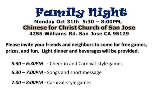 10/31/2016 家庭晚會(family night) October 31, 2016 5:30 pm – 8:00 pm 聖荷西中華歸主教會 4255 Williams Road San Jose, CA 95129 10/31(周一)晚上 5:30-8:00 在教會舉行,讓我們及社區的孩子能有安全又有意義的晚會,而不隨俗慶祝萬聖節,歡迎邀請小學以下年齡的孩童參加。晚會贈送糖果為遊戲獎品,願意奉獻現金購買獎品請註明 Family Night。仍需十位同工協助晚會進行,有負擔提供人力協助的弟兄姊妹請洽夏祖匡執事 gsya@hotmail.com。