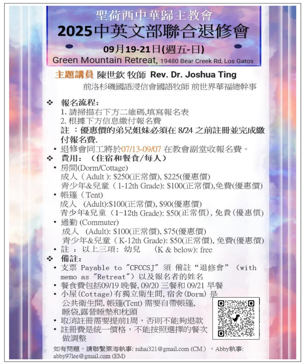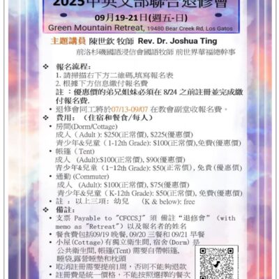 2025退修會 September 19 – 21, 2025 Green Mountain Retreat 退修會:2025 年度中英文部聯合退修會將於 09/19-21 (週五-日)在 Los Gatos 的 Green Mountain Retreat 場地舉行。本次退修會中文部邀請到陳世欽牧師作主題講員,敬請弟兄姊妹預留時間參加。如有疑問,請與粟海執事聯絡 suhai123@gmail.com。